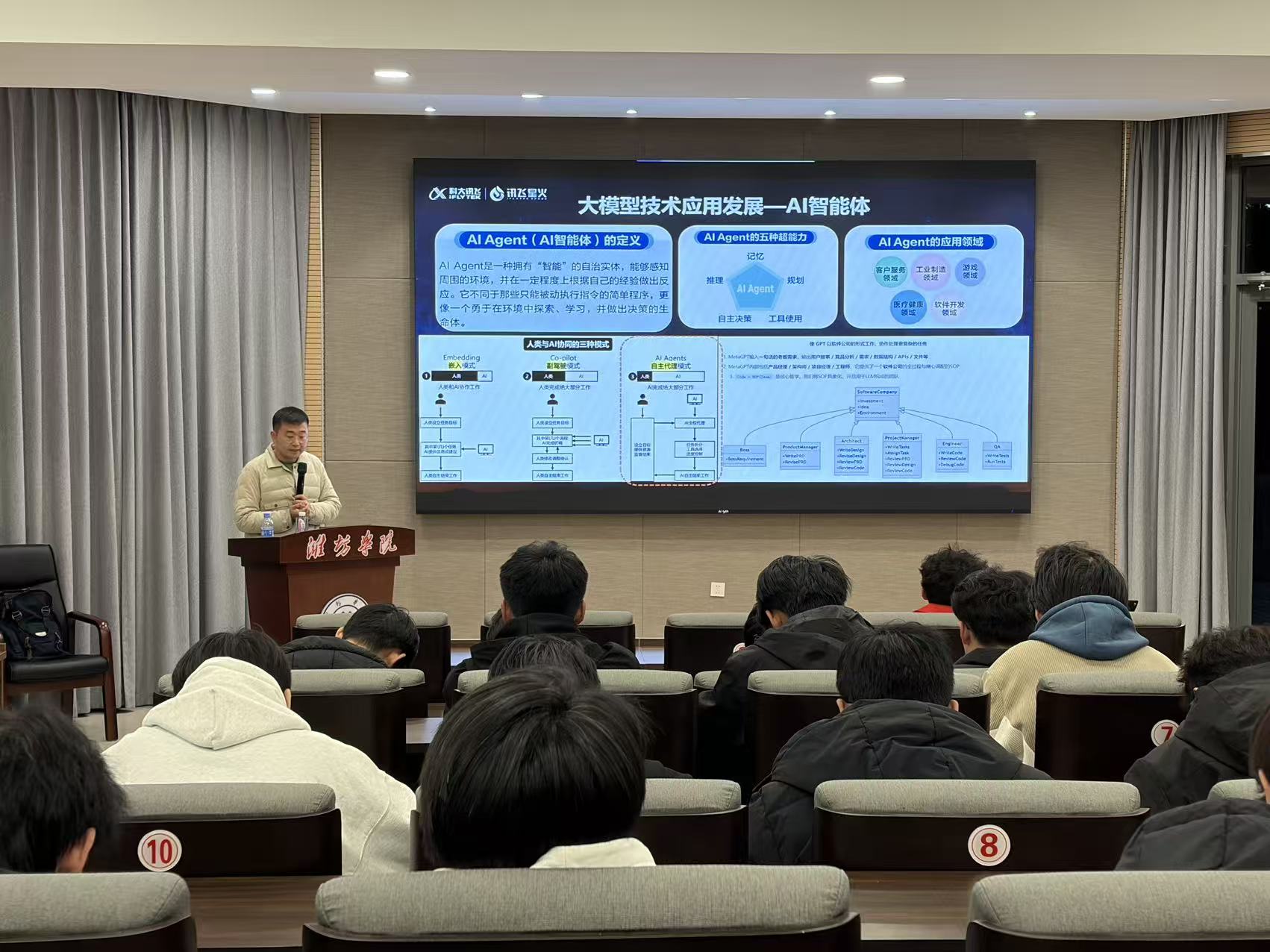 主讲人朱吉光老师围绕人工智能发展历程、核心技术突破、智能体应用场景等核心内容展开分享,系统解读了大模型、AI Agent等前沿技术的发展趋势,以及人工智能在高校“教、学、研、管”全流程的落地案例。从语音识别、机器翻译等技术突破,到星火科研助手、讯飞智文等智能工具的实操应用,再到AI对就业结构、教育模式的深刻影响,主讲人以详实的数据、生动的案例,清晰勾勒出人工智能赋能高等教育的路径与前景。互动交流环节,师生们结合自身学习、教学与科研实际,就AI工具使用、人机协同模式、教育数字化转型等问题展开热烈探讨。大家纷纷表示,此次讲座既拓宽了对人工智能技术的认知边界,也为将AI工具应用于日常学习和教学工作提供了具体思路,有助于在智能化时代提升自身核心竞争力。